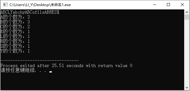 1 #include<stdio.h> 2 int main(){ 3 char ch[100]; 4 int num[26]; 5 int len=0; 6 int i,j,max; 7 8 for(i=0;i<26;i++){ 9 num[i] = 0; 10 } 11 while(1){ //读入字符 12 scanf("%c",&ch[len]); 13 len++; 14 if(ch[len-1]=='$'){ 15 break; 16 } 17 } 18 for(i=0; i<len; i++){ //统计各元素的个数 19 if(ch[i]>='A' && ch[i]<='Z'){ 20 num[ch[i]-'A']++; 21 } 22 } 23 for(i=0;i<26;i++){ //遍历输出 24 max = i; 25 for(j=0;j<26;j++){ //找到最大值 26 if(num[j]>num[max]){ 27 max = j; 28 } 29 } 30 if(num[max] != 0){ 31 printf("%c的个数为:%d\n",'A'+max, num[max]); 32 num[max]=0; 33 } 34 } 35 return 0; 36 }