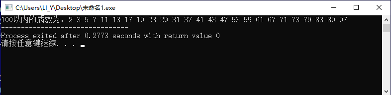 1 #include<stdio.h> 2 int isZhuShu(int n); 3 int main(){ 4 int i; 5 int num[50]; 6 int len=0; 7 for(i=2;i<100;i++){ 8 if(isZhuShu(i)==1){ 9 num[len] = i; 10 len++; 11 } 12 } 13 printf("100以内的质数为:"); 14 for(i=0;i<len;i++){ 15 printf("%d ",num[i]); 16 } 17 18 return 0; 19 } 20 int isZhuShu(int n){ //判断质数 21 int flag=1; 22 int i,j; 23 for(i=2;i<=n/2;i++){ 24 if(n%i==0){ 25 flag = 0; 26 } 27 } 28 return flag; 29 }