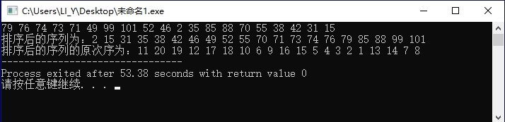 1 #include<stdio.h> 2 void BubbleSort(int a[][20]); 3 int main(){ 4 int a[2][20]; 5 int i,j; 6 int x; 7 for(i=0;i<20;i++){ 8 a[0][i] = i+1; 9 } 10 for(i=0;i<20;i++){ 11 scanf("%d",&a[1][i]); 12 } 13 BubbleSort(a); 14 printf("排序后的序列为:"); 15 for(i=0;i<20;i++){ 16 printf("%d ",a[1][i]); 17 } 18 printf("\n排序后的序列的原次序为:"); 19 for(i=0;i<20;i++){ 20 printf("%d ",a[0][i]); 21 } 22 23 return 0; 24 } 25 void BubbleSort(int a[][20]){ 26 int flag; 27 int i,j; 28 int temp; 29 for(i=0;i<20;i++){ 30 flag = 1; 31 for(j=1;j<20-i;j++){ 32 if(a[1][j-1]>a[1][j]){ 33 temp = a[1][j-1]; //元素交换 34 a[1][j-1] = a[1][j]; 35 a[1][j] = temp; 36 temp = a[0][j-1]; //位序交换 37 a[0][j-1] = a[0][j]; 38 a[0][j] = temp; 39 flag = 0; 40 } 41 } 42 if(flag == 1){ 43 return; 44 } 45 } 46 return; 47 }