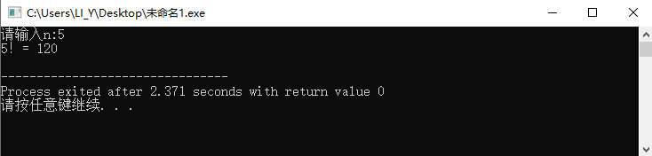 1 #include<stdio.h> 2 int diGui(int n); 3 int main(){ 4 int n; 5 int result; 6 printf("请输入n:"); 7 scanf("%d", &n); 8 result = diGui(n); 9 printf("%d!= %d\n", n, result); 10 return 0; 11 } 12 int diGui(int n){ 13 if(n==1){ 14 return 1; 15 } 16 return n*diGui(n-1); 17 }