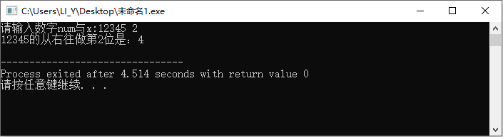 1 #include<stdio.h> 2 int digit(int num, int x); //num表示待查找的数,x表示从右往左第x位 3 int main(){ 4 int num,x; 5 int result; 6 printf("请输入数字num与x:"); 7 scanf("%d %d",&num,&x); 8 result = digit(num, x); 9 printf("%d的从右往做第%d位是:%d\n", num, x, result); 10 return 0; 11 } 12 int digit(int num, int x){ 13 int temp; 14 int i; 15 for(i=0; i<x; i++){ 16 temp = num % 10; 17 num = num /10; 18 } 19 return temp; 20 }