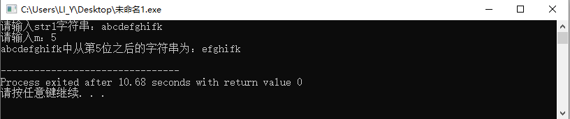 1 #include<stdio.h> 2 #include<string.h> 3 void fun1(char str1[], char str2[], int m); 4 int main(){ 5 char str1[100],str2[100]; 6 int m; 7 printf("请输入str1字符串:"); 8 scanf("%s",&str1); 9 printf("请输入m:"); 10 scanf("%d",&m); 11 fun1(str1, str2, m); 12 printf("%s中从第%d位之后的字符串为:%s\n",str1,m,str2); 13 return 0; 14 } 15 void fun1(char str1[], char str2[], int m){ 16 int len = strlen(str1); 17 int i=0, j=m-1; 18 for(;j<len;i++,j++){ 19 str2[i] = str1[j]; 20 } 21 }