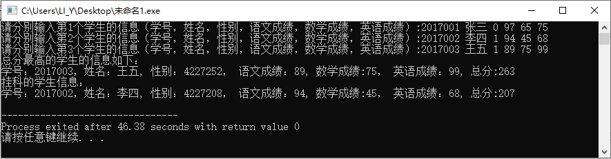 1 #include<stdio.h> 2 struct Student{ 3 int stuNo; //学号 4 char name[20]; //姓名 5 int gender; //性别:0表示男,1表示女 6 int grade[3]; //三科成绩 7 int total; //总分 8 }Stu[3]; 9 int main(){ 10 int i,j; 11 int total; 12 int max = 0; 13 for(i=0; i<3; i++){ //输入学生信息 14 total = 0; 15 printf("请分别输入第%d个学生的信息(学号,姓名,性别,语文成绩,数学成绩,英语成绩):", i+1); 16 scanf("%d %s %d %d %d %d",&Stu[i].stuNo, &Stu[i].name, &Stu[i].gender, &Stu[i].grade[0], &Stu[i].grade[1], &Stu[i].grade[2]); 17 for(j=0; j<3; j++){ 18 total += Stu[i].grade[j]; 19 } 20 Stu[i].total = total; 21 } 22 for(i=1; i<3; i++){ //查找总分最高学生 23 if(Stu[i].total > Stu[max].total){ 24 max = i; 25 } 26 } 27 printf("总分最高的学生的信息如下:\n"); 28 printf("学号:%d,姓名:%s, 性别:%d, 语文成绩:%d, 数学成绩:%d, 英语成绩:%d, 总分:%d\n",Stu[max].stuNo, Stu[max].name, Stu[max].grade, Stu[max].grade[0], Stu[max].grade[1], Stu[max].grade[2], Stu[max].total); 29 for(i=0; i<3; i++){ //查找不及格学生信息 30 for(j=0; j<3; j++){ 31 if(Stu[i].grade[j]<60){ 32 printf("挂科的学生信息:\n"); 33 printf("学号:%d,姓名:%s, 性别:%d, 语文成绩:%d, 数学成绩:%d, 英语成绩:%d, 总分:%d\n",Stu[i].stuNo, Stu[i].name, Stu[i].grade, Stu[i].grade[0], Stu[i].grade[1], Stu[i].grade[2], Stu[i].total); 34 break; 35 } 36 } 37 } 38 return 0; 39 }