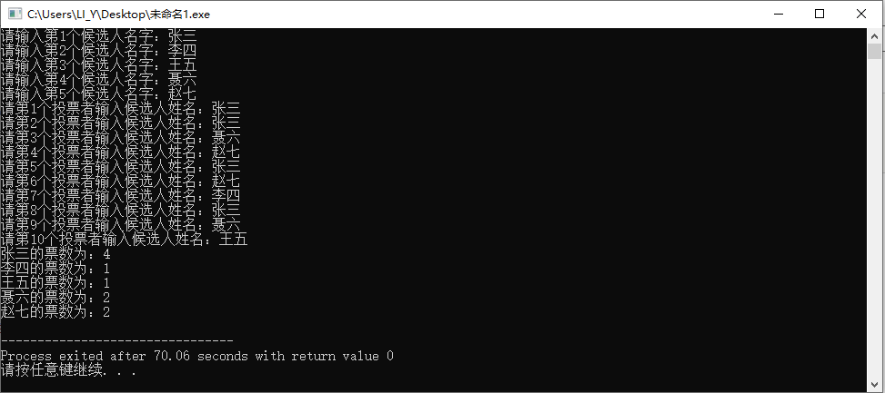 1 #include<stdio.h> 2 #include<string.h> 3 #define HOUXUAN 5 4 #define TOUPIAO 10 5 struct houxuan{ 6 char name[20]; 7 int countTicket; 8 }houxuan[HOUXUAN]; 9 int main(){ 10 char name[20]; 11 int i,j; 12 for(i=0;i<HOUXUAN;i++){ 13 printf("请输入第%d个候选人名字:",i+1); 14 scanf("%s",&houxuan[i].name); 15 houxuan[i].countTicket = 0; 16 } 17 for(i=0;i<TOUPIAO;i++){ 18 printf("请第%d个投票者输入候选人姓名:",i+1); 19 scanf("%s",&name); 20 for(j=0;j<HOUXUAN;j++){ 21 if(strcmp(name,houxuan[j].name) == 0){ 22 houxuan[j].countTicket++; 23 } 24 } 25 } 26 for(i=0;i<HOUXUAN;i++){ 27 printf("%s的票数为:%d\n", houxuan[i].name,houxuan[i].countTicket); 28 } 29 return 0; 30 }