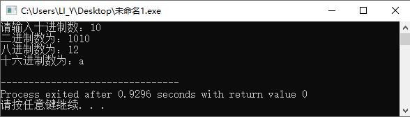 1 #include<stdio.h> 2 int main(){ 3 int x; 4 int num[50]; 5 int i,len=0,temp; 6 printf("请输入十进制数:"); 7 scanf("%d",&x); 8 temp = x; 9 for(i=0;temp!=0;temp/=2,i++){ 10 num[i] = temp%2; 11 len++; 12 } 13 printf("二进制数为:"); 14 for(i=len-1; i>=0; i--){ 15 printf("%d",num[i]); 16 } 17 printf("\n八进制数为:%o\n",x); 18 printf("十六进制数为:%x\n",x); 19 return 0; 20 }