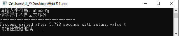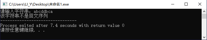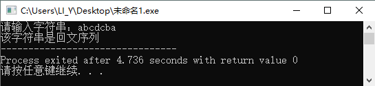 1 #include<stdio.h> 2 #include<string.h> 3 int isHuiWen(char str[], int n); 4 int main(){ 5 char str[100]; 6 int len,result; 7 printf("请输入字符串:"); 8 scanf("%s",&str); 9 len = strlen(str); 10 result = isHuiWen(str,len); 11 if(result == 1){ 12 printf("该字符串是回文序列"); 13 }else{ 14 printf("该字符串不是回文序列"); 15 } 16 return 0; 17 } 18 int isHuiWen(char str[], int n){ 19 int result; 20 int i=0,j=n-1; 21 22 while((str[i]==str[j]) && (i<=n/2) && (j>=n/2)){ 23 i++;j--; 24 } 25 if((i-2) == j || (i-1)== j){ //奇数个字符和偶数个字符的两种情况 26 return 1; 27 }else{ 28 return 0; 29 } 30 }