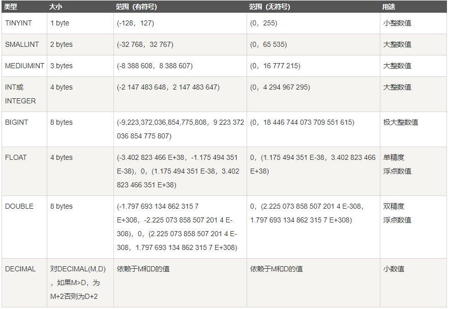 - 作为SQL标准的扩展,MySQL也支持整数类型TINYINT、MEDIUMINT和BIGINT。下面的表显示了需要的每个整数类型的存储和范围