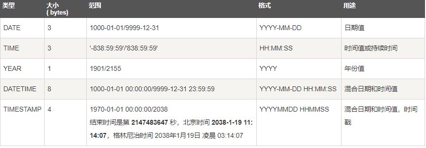 - 表示时间值的日期和时间类型为DATETIME、DATE、TIMESTAMP、TIME和YEAR。