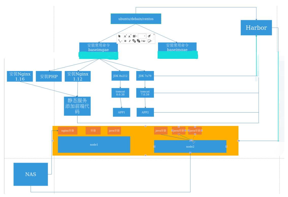 打完了这几层镜像之后,下面就是运行这些镜像的各个node节点也就是所谓的宿主机,要保证我们的宿主机能够在公司的harbor上去拉取镜像,当宿主机拉取完了镜像之后,我们就让该宿主机运行一个容器。然后再将所有nginx容器的数据都存放到NAS存储上,以实现数据同步。而NAS存储是先挂载在宿主机上,然后是宿主机将这个存储给各个容器去使用。由java容器往NAS存储上写数据,再由nginx容器来读NAS存储上的数据,所以他们实际上是看到的同一份数据