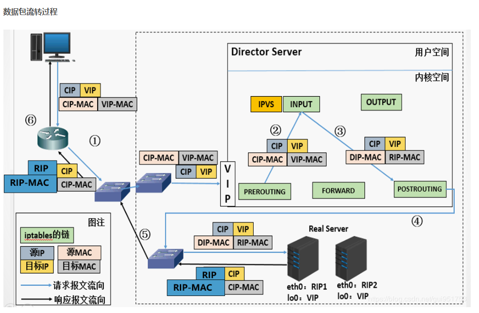 核心:Director改数据包的目标MAC地址为RIP网卡对应的MAC(Director必须得知道RIP的MAC地址。通过ARP广播查询)