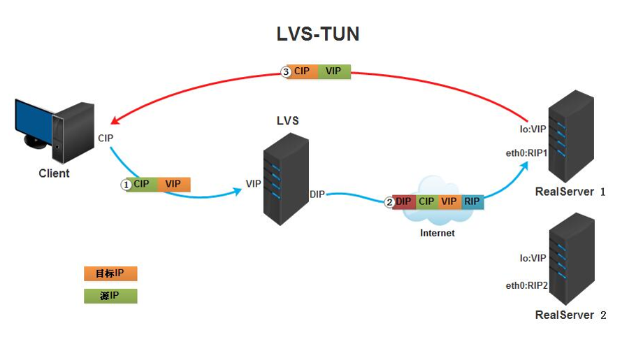 2.负载均衡器收到报文后,发现请求的是在规则里面存在的地址,那么它将在客户端请求报文的首部再封装一层IP报文,将源地址改为DIR