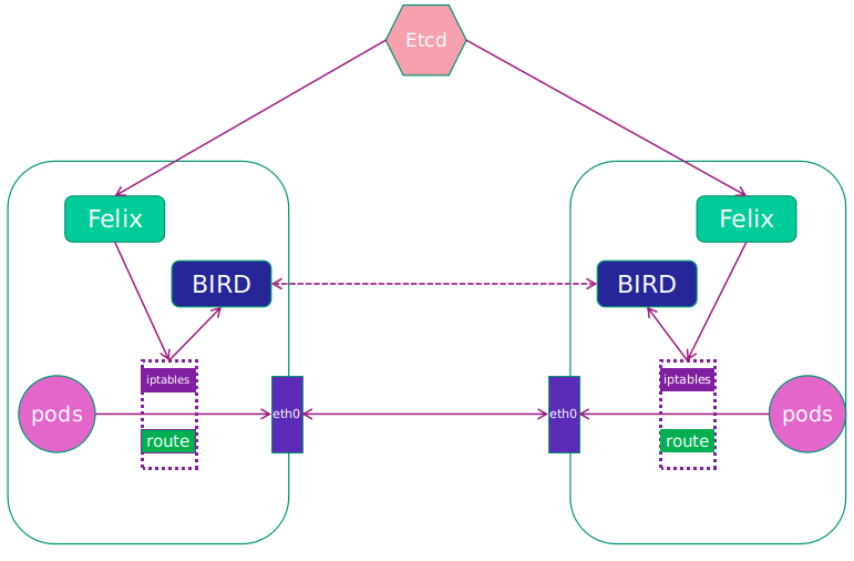 此外,在运行Felix或orchstrator插件的每台计算机上,会运行一个etcd代理服务。这减少了etcd核心集群上的负载,并为主机节点屏蔽了etcd服务集群的细节。在etcd集群与orchstrator插件在同一台机器上都有成员的情况下,可以放弃在该机器上使用etcd代理。