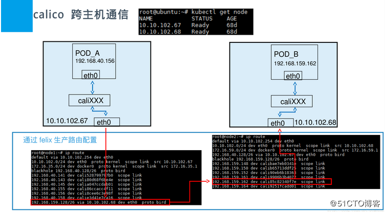 这样通过calico就完成了Node间容器网络的设置 ,在后续的pod创建过程中,Kubelet将通过CNI接口调用 calico进行Pod的网络设置包括IP地址,路由规则,Iptables规则