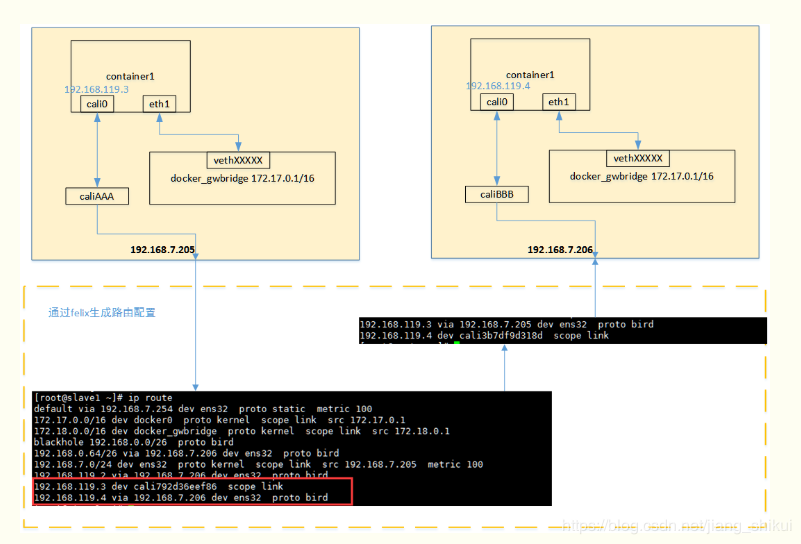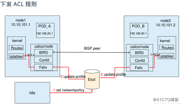 路由信息分发,当Felix将路由插入Linux内核FIB时,BGP客户端将接收它们并将它们分发到集群中的其他工作节点。