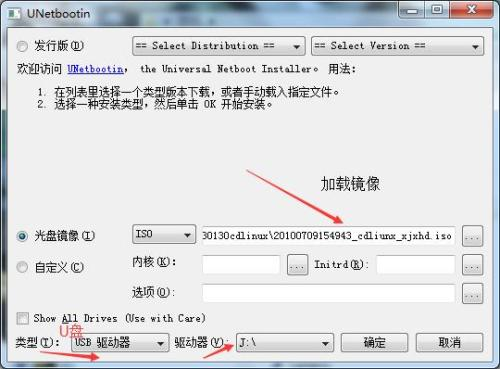 1.打开unetbootin-windows-585,,选择第二项光盘镜像,载入你刚下载的CDlinux-0.9.7.iso文件路径,选择你的U盘,确定
