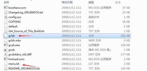 2.打开下载grub4dos,选择grldr和menu 文件,复制到U盘的根目录,复制之后u盘里面是这样