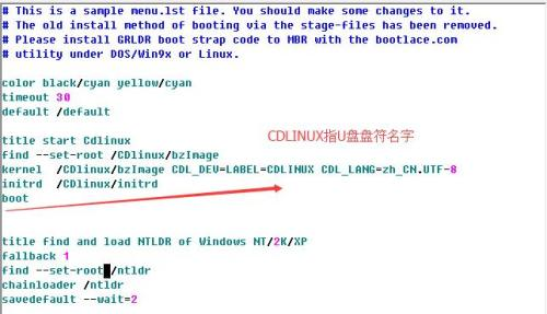 在上面的menu.lst内的CDL_DEV=LABEL=CDLINUX 中的CDLINUX是指U盘的标签名