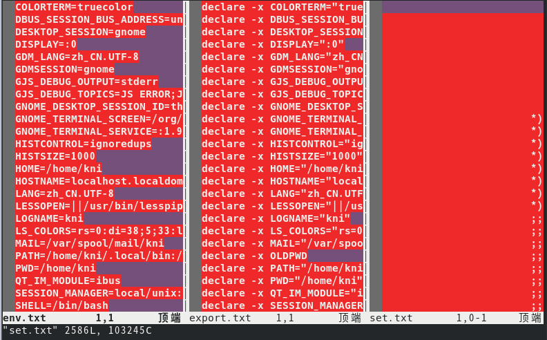 $ vimdiff env.txt export.txt set.txt