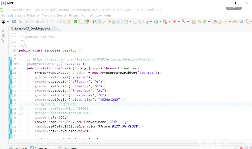 JavaCV的demo中有摄像头及麦克风采集音视频数据的例子,例子中采集摄像头数据时使用的就是OpenCVFrameGrabber,而画面回显采用CanvasFrame这个类。