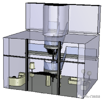 本算例仿真的建筑物室内结构如下图所示,是原Fluent谢菲尔德办公室的前台接待处。接待处的正面几乎是一整面透明玻璃,二楼楼梯的顶部还有一小块玻璃顶面。仿真在夏季的时候,考虑太阳辐射的作用,同时开启空调系统时,接待处内的流动和传热情况。