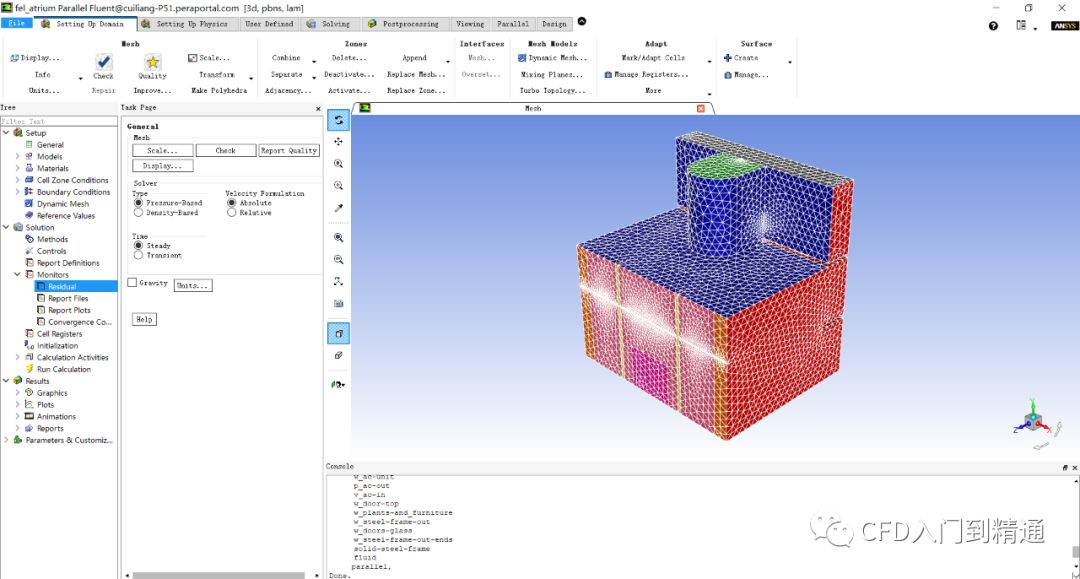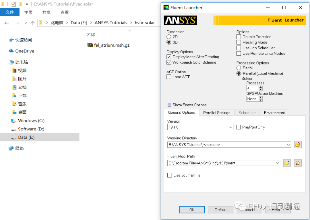 在硬盘上创建英文名称的文件夹(例如hvacsolar),将网格文件fel_atrium.msh.gz拷贝至该目录下。启动Fluent 19.1,在Fluent Launcher中,Dimension选择3D,Display Options中勾选Display Mesh After Reading和Workbench Color Scheme,Processing Options选择Parallel,设置使用4个Processes并行计算(用户可以根据现有的硬件资源和License授权酌情选择合适的并行数),更改Working Directory路径至该网格文件目录下,点击OK启动Fluent 19.1。