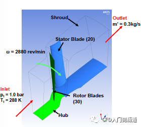本例以轴流风扇流场为例,介绍旋转机械计算设置及后处理的一般步骤。计算网格由两部分组成:出口导叶叶片流道网格和转子叶片流道网格。导叶叶片整周共20个,转子叶片整周共30个。转子以2880rpm的转速绕z轴旋转,导叶保持固定。整个计算中介质为理想空气,流动状态假设为稳态。