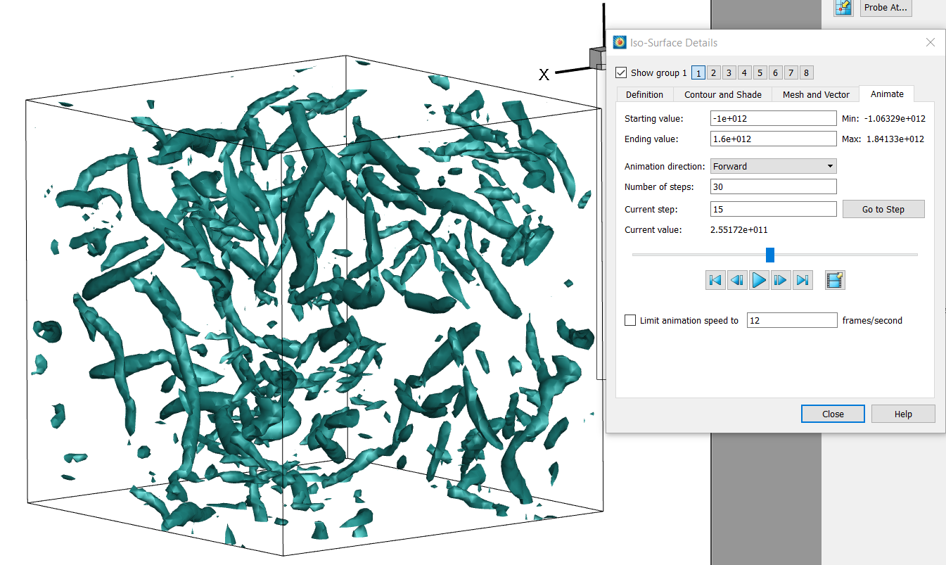 3. 勾选Iso-Surface,显示涡量等值线图(Q 准则),并在Animate中设置Current value,如图所示: