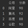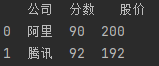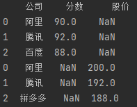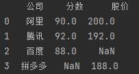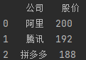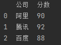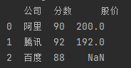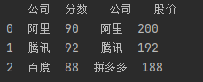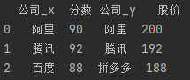 import pandas as pd df1 = pd.DataFrame({'公司':['阿里','腾讯','百度'],'分数':[90,92,88]}) df2 = pd.DataFrame({'公司':['阿里','腾讯','拼多多'],'股价':[200,192,188]}) df3 = pd.merge(df1,df2)