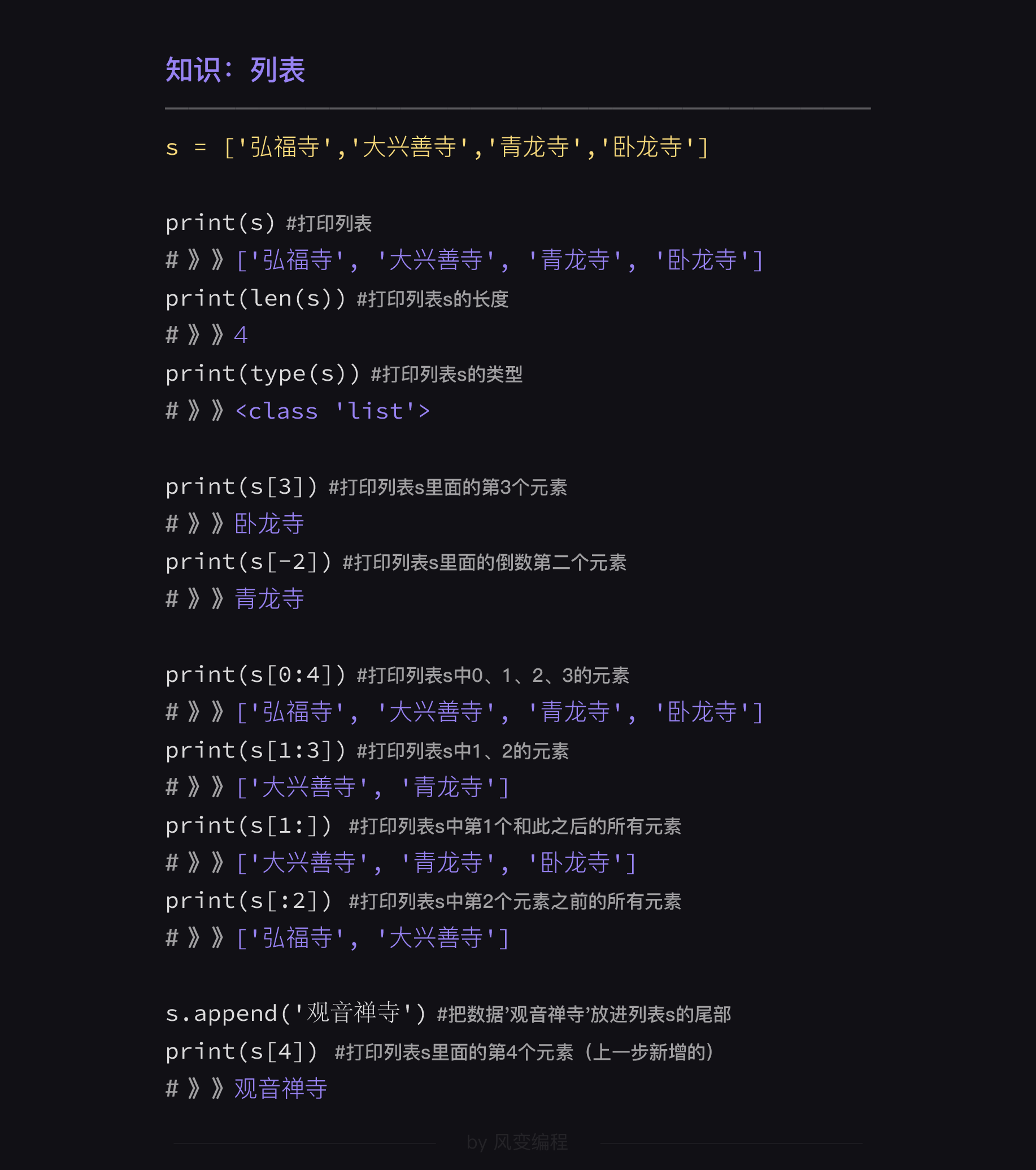 一个列表需要用中括号[ ]把里面的各种数据框起来,里面的每一个数据叫作“元素”。每个元素之间都要用英文逗号隔开。