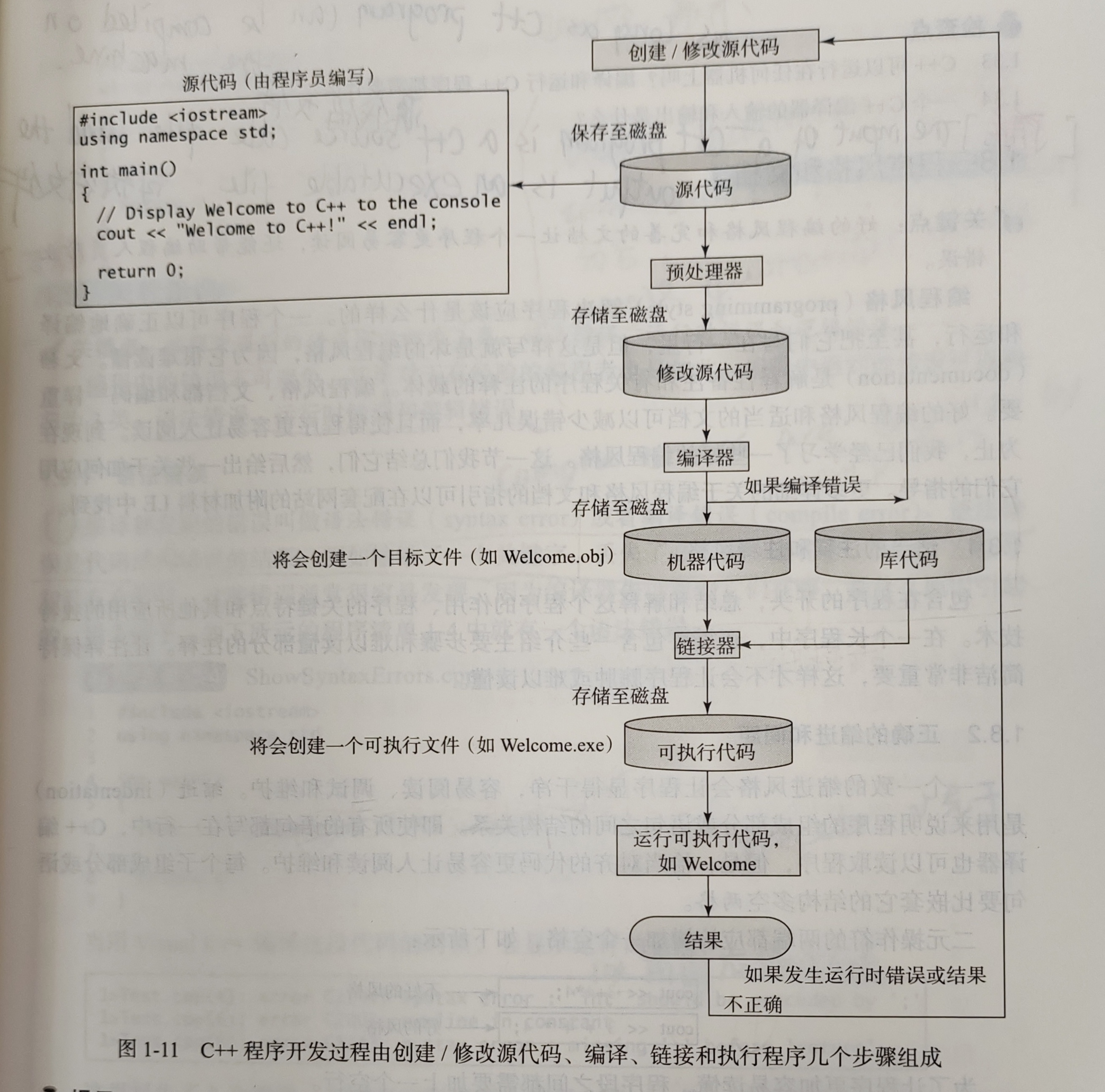 C++的开发周期包括创建/修改源代码、编译、链接和执行程序。【我们必须首先创建一个程序,编译它,然后才能执行】,这个过程是反复的,如果程序出现编译错误,我们就必须修改程序修正错误,然后重新编译。如果程序运行时发生错误,或者没有生成正确的结果,那么还是要修改程序,重新编译然后再执行一次。C++编译器只执行了三个任务:预处理(preprocessing),编译(compling)和链接(linking)因此一个C++程序包含了三个不同的程序:预处理器(preprocessor),编译器(compiler)和链接器(linker),为了简单起见,我们把涉及3个程序合起来统称为C++编译器。