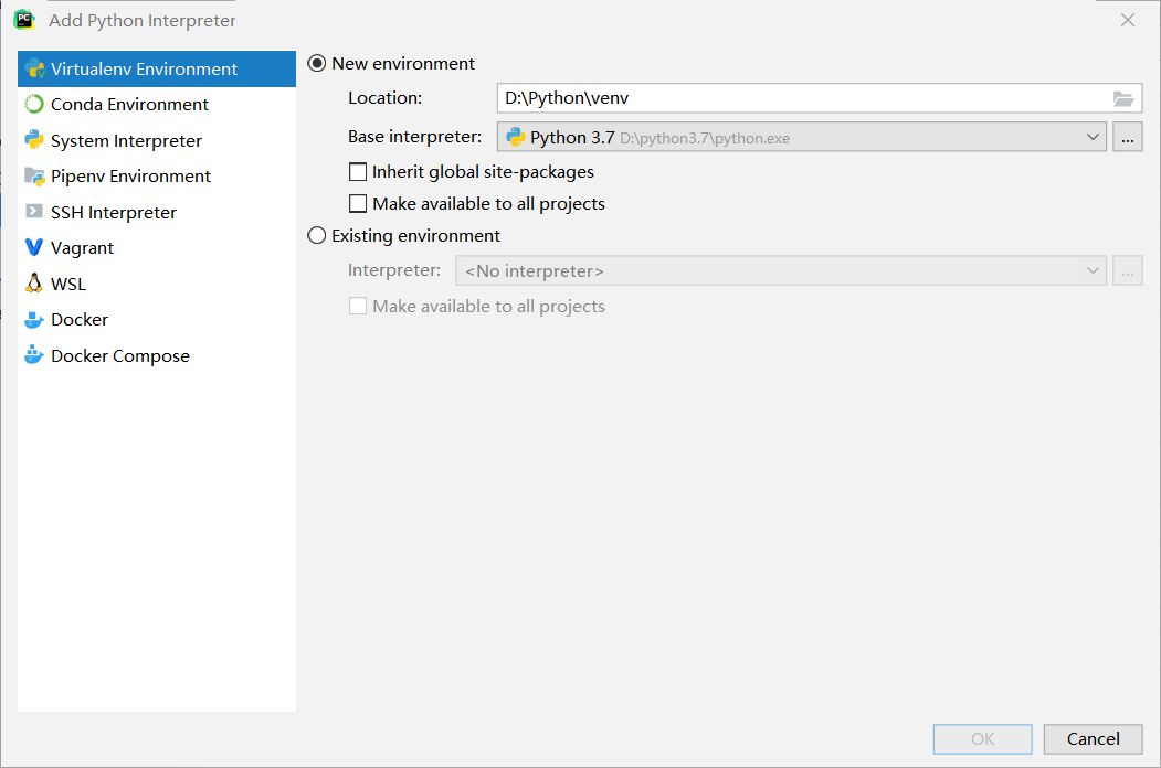 - System Interpreter:使用系统解释器,就是使用本地的环境,当初安装python的时候用pip装了一些包就会在这里。