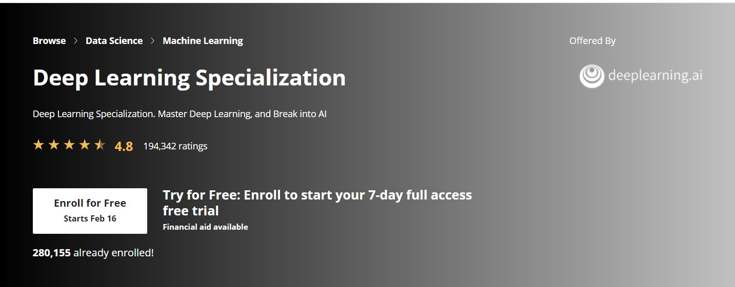 这是承接机器学习后吴恩达的一套课程,里面包含神经网络之类的5门子课程,学习方法同上。