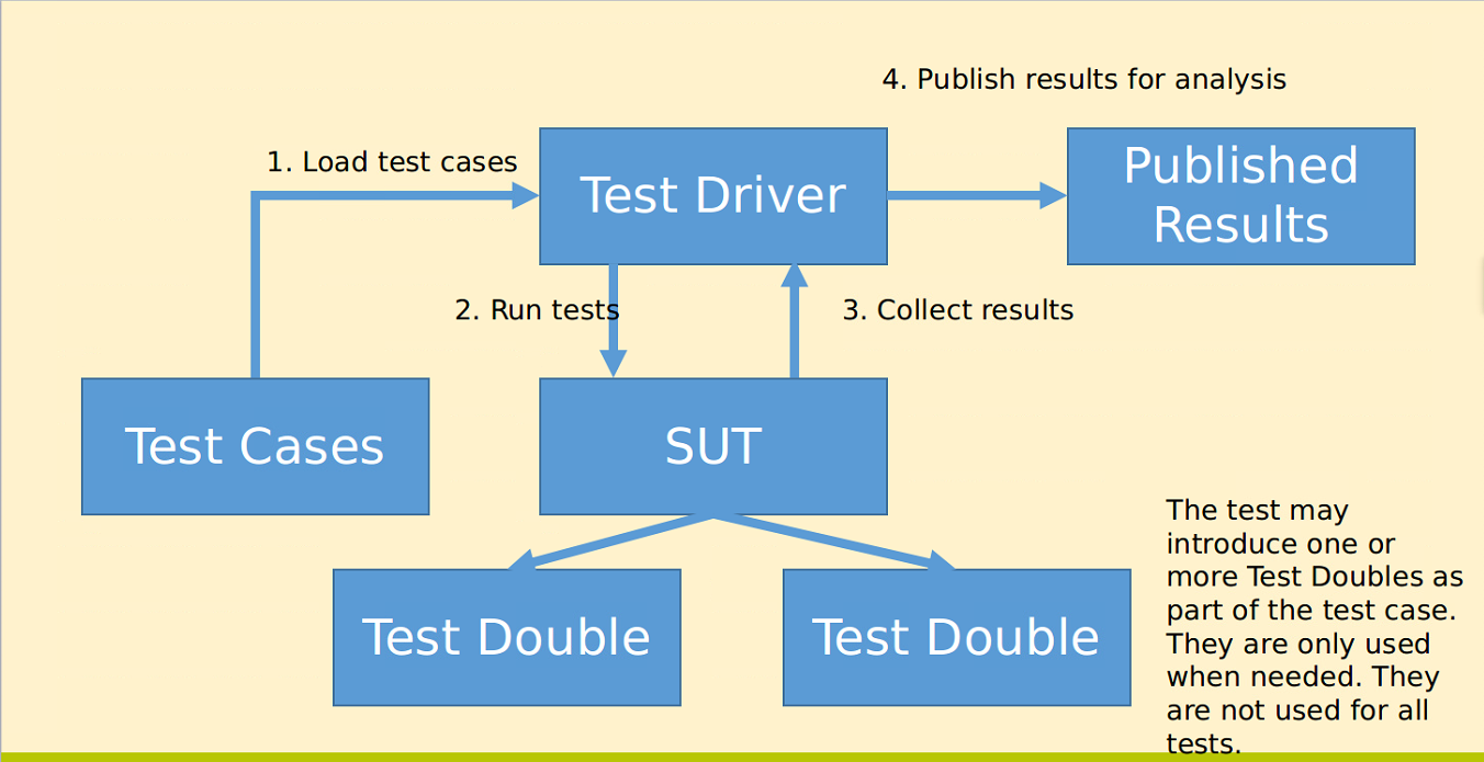 Test Double: is used to simulate the modules that the SUT will interact with. These are typically used to process limited situations (‘pre-set data’)