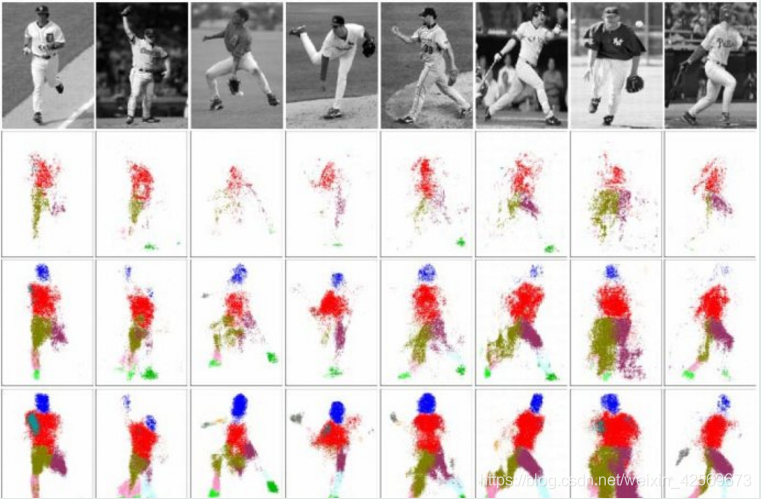 Auto-context 算法便是一种能有效识别物体的统计模型。其实人们早就发现context和高层次信息在物体识别及场景理解中有着关键的作用,却总是找不到一种有效的解决模型。注意这里的context有各种各样的意思,可以是物体的内部轮廓、形态,也可以是物体间的各种关系。比如,一张清楚的马脸暗示着它的尾巴和腿的位置,这是通常被忽略掉且很难识别出来的。又比如一幅图像中的汽车暗示着公路的存在,反之看到公路的图像人们也联想汽车的存在。所谓识别即是分类,设X表示的是各种数据,Y表示数据的类别,通过对这些数据的学习使得分类器在看到一个新的数据X时,能准确地找到它的类别Y。传统的分类器完成对训练数据的学习后便一直用这个自身去预测新的数据。而auto-context是一个迭代的过程,其第一步用传统分类器对新数据进行识别,得到这个数据属于各类别的概率P(0)(i);第二步的数据训练集S不仅包含数据X,类别Y,还包含有上述所得的P(0)(i),得到一个新的分类器后再对新数据识别得到其分别属于个类别的概率P(1)(i);更新S中的P,重复第二步,一直到收敛,即P几乎不变。这时便得到比传统方法更清晰的识别图像。如下图所示,第一行是输入的数据(图像),第二行是auto-context的第一次迭代结果,也是用传统的分类器识别后得到的分类图,第三和第四行分别是auto-context的第三次和第五次迭代结果。
