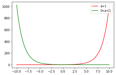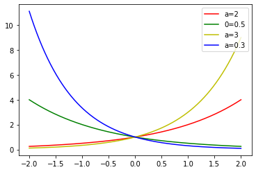 import matplotlib.pyplot as plt import numpy as np from scipy import stats x=np.linspace(-2,2, 500,dtype=float) y=np.power(2,x) y1=np.power(0.5,x) y2=np.power(3,x) y3=np.power(0.3,x) plt.plot(x,y,color='r',label='a=2') plt.plot(x,y1,color='g',label='0=0.5') plt.plot(x,y2,color='y',label='a=3') plt.plot(x,y3,color='b',label='a=0.3') plt.legend(loc='upper right')#把图例放在右上角 plt.show()