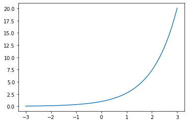 x=np.linspace(-3,3, 500,dtype=float) y=np.power(np.e,x) plt.plot(x,y,label='a=e')