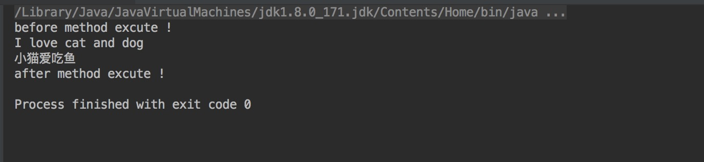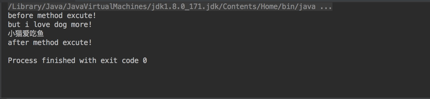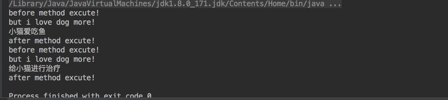 public class DynamicProxy1 implements InvocationHandler { private Object target; public DynamicProxy1(Object target) { this.target = target; } @Override public Object invoke(Object proxy, Method method, Object[] args) throws Throwable { System.out.println("before method excute !"); Object obj = method.invoke(target, args); System.out.println("after method excute !"); return null; } public static void main(String[] args) { System.getProperties().setProperty("sun.misc.ProxyGenerator.saveGeneratedFiles", "true"); IAnimal cat = new Cat(); DynamicProxy1 handle = new DynamicProxy1(cat); IAnimal iAnimal = (IAnimal) Proxy.newProxyInstance(cat.getClass().getClassLoader(), cat.getClass().getInterfaces(), handle); iAnimal.eat(); } }