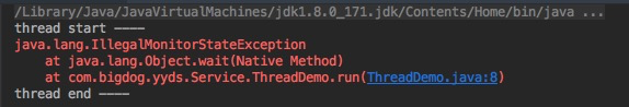 运行后结果报错, 这句话的意思是: 线程试图等待对象的监视器或者试图通知其他正在等待对象监视器的线程,但本身没有监视器的所有权。 wait 是一个本地方法,其底层是通过一个叫做监听器锁的对象来完成的。上面之所以抛出异常,是因为在调用 wait() 方法时没有获取到 monitor 对象的所有权,那如何获取 monitor 对象的所有权? java 中只能通过 synchronized 关键字来完成,修改后增加 Synchronized 关键字: