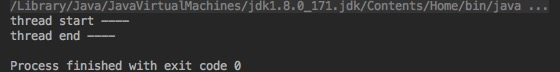 public class ThreadDemo extends Thread{ public void run() { System.out.println("thread start ----"); try { wait(2000); } catch (Exception e) { e.printStackTrace(); } System.out.println("thread end ----"); } public static void main(String[] args) throws Exception{ ThreadDemo threadDemo = new ThreadDemo(); threadDemo.start(); } }