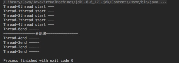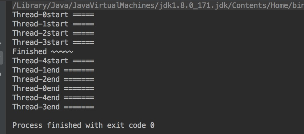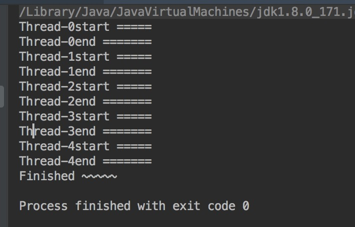 package com.bigdog.yyds.Service; public class JoinDemo implements Runnable{ @Override public void run() { try{ System.out.println(Thread.currentThread().getName() + "start ====="); Thread.sleep(1000); System.out.println(Thread.currentThread().getName() + "end ======="); }catch (Exception e) { e.printStackTrace(); } } public static void main(String[] args) { for(int i=0;i<5;i++) { Thread test = new Thread(new JoinDemo()); test.start(); } System.out.println("Finished ~~~~~"); } }
