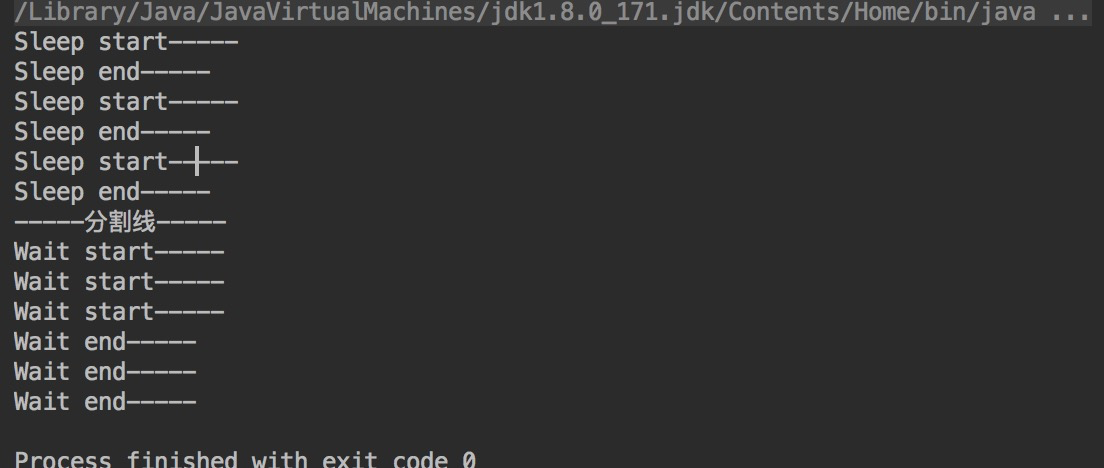 package com.bigdog.yyds.Service; public class SleepDemo { public synchronized void sleepMethod() { System.out.println("Sleep start -----------"); try{ Thread.sleep(1000); }catch (Exception e) { e.printStackTrace(); } System.out.println("Sleep end -----------"); } public synchronized void waitMethod() { System.out.println("Wait Start ---------"); try{ wait(1000); }catch (Exception e){ e.printStackTrace(); } System.out.println("Wait End ---------"); } public static void main(String[] args) { SleepDemo test1 = new SleepDemo(); for(int i=0; i<3; i++) { new Thread(new Runnable() { @Override public void run() { test1.sleepMethod(); } }).start(); } try{ Thread.sleep(10000); //暂停10s,等待上面程序执行完成 }catch (Exception e) { e.printStackTrace(); } System.out.println("--------分割线--------------"); SleepDemo test2 = new SleepDemo(); for(int i=0;i<3;i++) { new Thread(new Runnable() { @Override public void run() { test2.waitMethod(); } }).start(); } } }