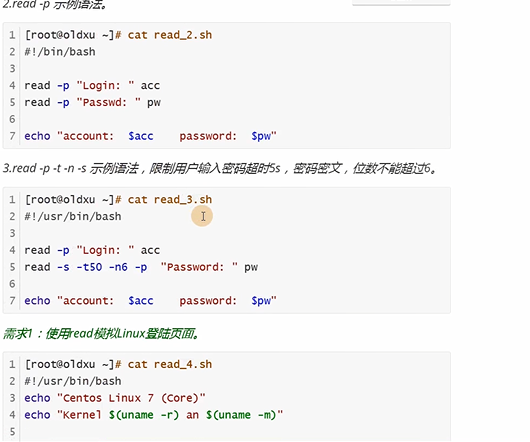1| [root@o1dxu ~]# cat read_ 1.sh 2| #!/bin/bash 3| echo -n "Login: 4 read acc 5 echo -n "Passwd: ” 7 read pw 9 echo " account:Sacc password: $pw"
