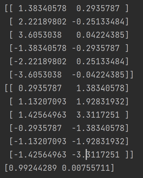 ##用sklearn的PCA import numpy as np from sklearn.decomposition import PCA X = np.array([[-1, -1], [-2, -1], [-3, -2], [1, 1], [2, 1], [3, 2]]) pca = PCA(n_components=1) newX = pca.fit_transform(X) invX = pca.inverse_transform(X) # 将降维后的数据转换成原始数据 print(newX) print(invX) print(pca.explained_variance_ratio_)