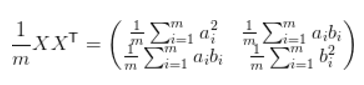 我们可以将矩阵看作作用于所有数据并朝向某个方向的力。同时我们还知道了变量间的相关性可以由方差和协方差表达,并且我们希望保留最大方差以实现最优的降维。因此我们希望能将方差和协方差统一表示,并且两者均可以表示为内积的形式,而内积又与矩阵乘法密切相关。因此我们可以采用矩阵乘法的形式表示。若输入矩阵 X 有两个特征 a 和 b,且共有 m 个样本,那么有: