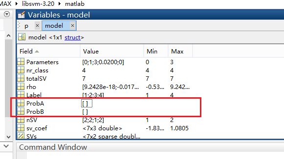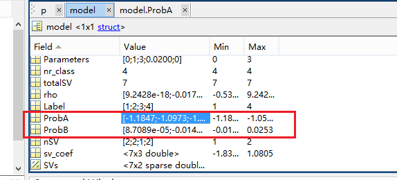 对比可知,训练时,如果未指定“-b 1”训练模型结构体中,ProbA和ProbB为空,指定时,为K*1的列向量,(K为训练样本类别数)