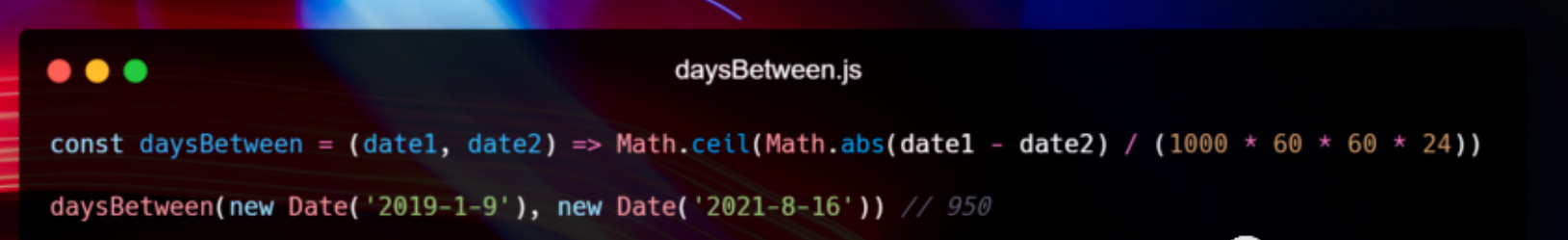 const daysBetween = (date1, date2) => Math.ceil(Math.abs(date1 - date2) / (1000 * 60 * 60 * 24))