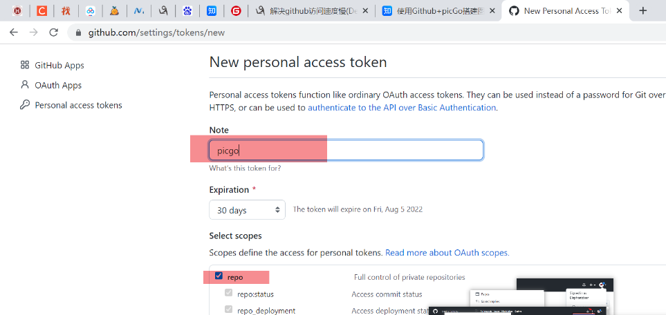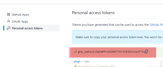 1.4如下图红色区域,复制token到文本保存(非常重要,后面设置picgo会用到):