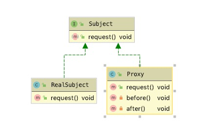 public class GamePlayerProxy implements IGamePlayer { //代练者名字 private String name; //被代练的玩家 private GamePlayer gamePlayer; public GamePlayerProxy(String name, GamePlayer gamePlayer) { this.name = name; this.gamePlayer = gamePlayer; } @Override public void login(String userName, String password) { before(userName); gamePlayer.login(userName,password); } @Override public void win() { this.gamePlayer.win(); } @Override public void upgrade() { this.gamePlayer.upgrade(); after(); } private void before(String userName){ System.out.println(this.name+"正在使用用户名"+userName+"登陆游戏"); } private void after(){ System.out.printf(this.name+":打上星耀了,一顿饭到手!"); } }