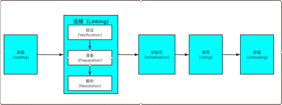 类从被加载到虚拟机内存中开始,到卸载出内存为止,它的整个过程包括:装载、验证、准备、解析、初始化、使用、卸载7个阶段。其中验证、准备、解析统称为链接。如下图