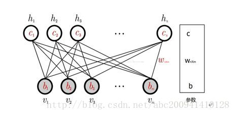 一个普通的RBM网络结构如上图所示,是一个双层模型,由m个可见层单元及n个隐层单元组成,其中,层内神经元无连接,层间神经元全连接,也就是说:在给定可见层状态时,隐层的激活状态条件独立,反之,当给定隐层状态时,可见层的激活状态条件独立。这保证了层内神经元之间的条件独立性,降低概率分布计算及训练的复杂度。RBM可以被视为一个无向图模型,可见层神经元与隐层神经元之间的连接权重是双向的,即可见层到隐层的连接权重为W,则隐层到可见层的连接权重为W'。除以上提及的参数外,RBM的参数还包括可见层偏置b及隐层偏置c。RBM可见层和隐层单元所定义的分布可根据实际需要更换,包括:Binary单元、Gaussian单元、Rectified Linear单元等,这些不同单元的主要区别在于其激活函数不同